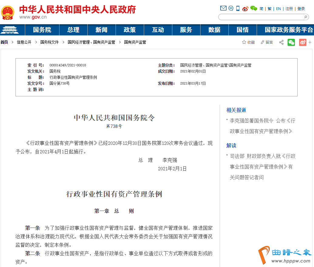 《行政事业性国有资产管理条例》,将自2021年4月1日起施行。