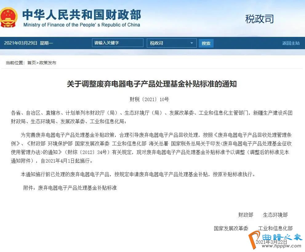 财政部、生态环境部等四部门联合印发《关于调整废弃电器电子产品处理基金补贴标准的通知》,自2021年4月1日起施行。