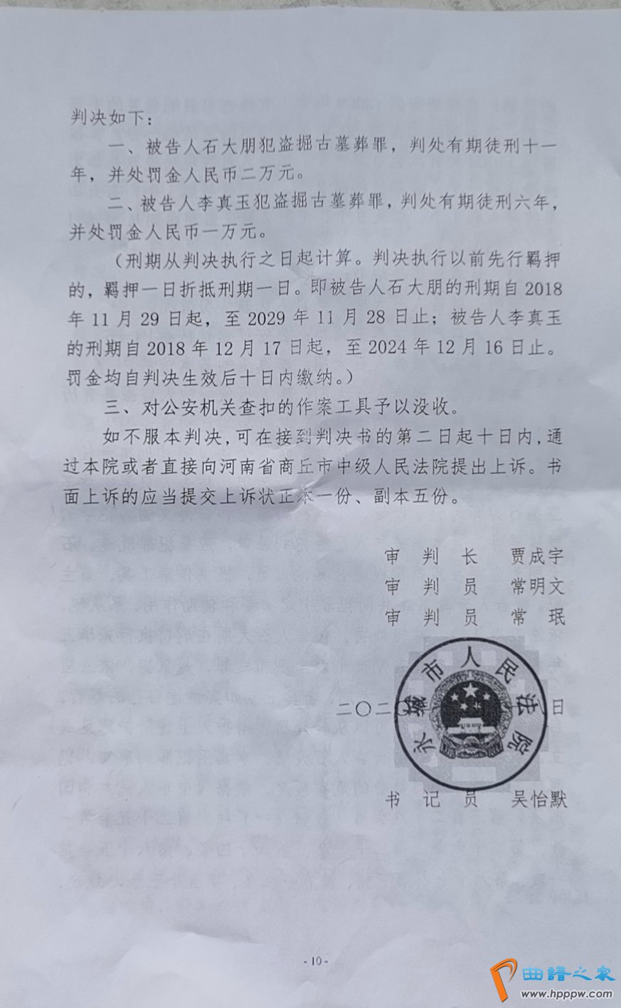 盗墓案被告人石大朋、李真玉的判决书。受访对象供图