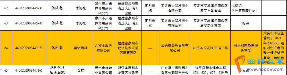 “九牧王股份有限公司”生产的一批次“男休闲鞋”上榜,原因是“衬里和内垫摩擦色牢度”不合格。相关情况同时显示,汕头市市场监管局于2021年2月25日组织对生产者的整改情况进行复查,结论为合格。