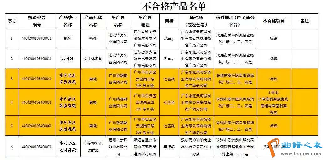 如商标为“七匹狼”的“男鞋”产品,有三批次上榜,均为“非天然皮革面鞋靴”,由“广州狼踞鞋业有限公司”生产,不合格项目主要涉及“标识”和“帮底剥离强度或底墙与帮面剥离强度”。