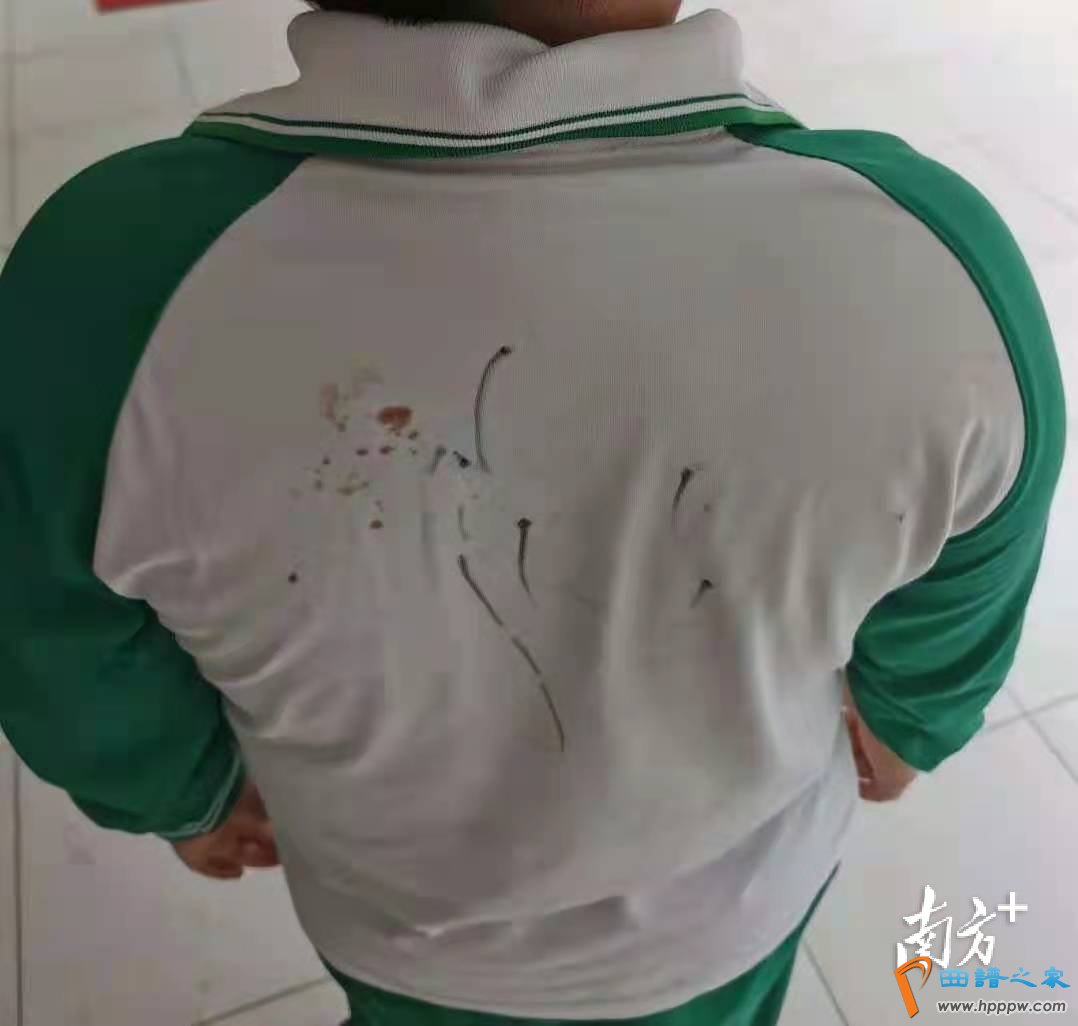 照片中,孩子背部、手臂以及眼睛多处伤口触目惊心,校服上衣被刺穿的破洞渗出血迹,该照片一经发出便引发了家长们的激烈讨论。