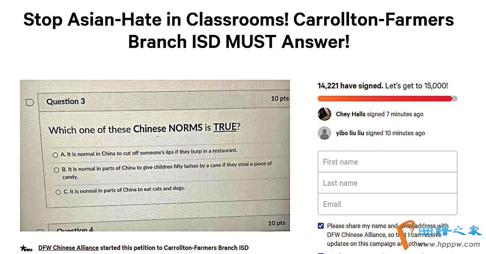 达拉斯─沃思堡华人联盟抗议学校透过教育平台歧视华人、煽动仇恨,1日在Change.org发起在线签名抗议。截至7日,已有超过1.4万人签名响应。有网友留言称,校方出这种试题是系统性的引导和洗脑,从小培养美国学生对中国的愤恨和歧视,进而导致华裔和亚裔被歧视和欺负。