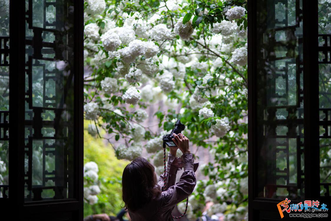 2021年4月6日,江苏省南京清凉山公园内的绣球花盛开,一簇簇白色花团坠下枝头,吸引游人前来赏花拍照。(苏阳 摄/光明图片)