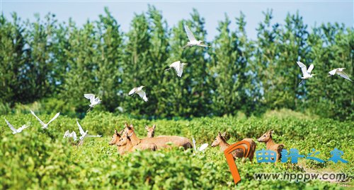 在湖南岳阳东洞庭湖麋鹿和鸟类救治避难中心拍摄的麋鹿和飞鸟(二〇二〇年八月七日摄)。该救治避难中心占地四百余亩,自建成后就承担起东洞庭湖区域全部麋鹿的救援、医治、康复和喂养任务。 新华社记者 陈思汗摄