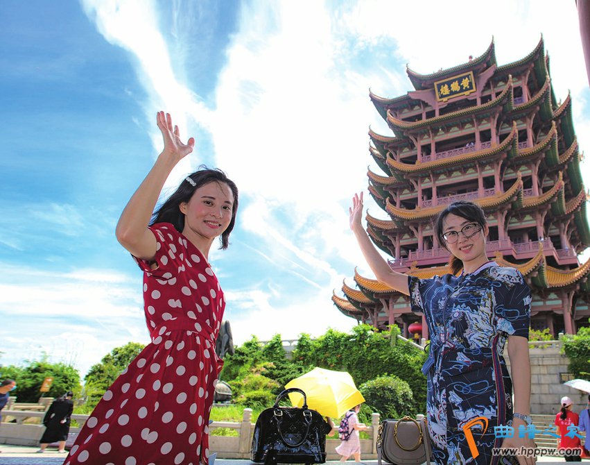 2020年8月7日,受邀来湖北旅游的海南援鄂医疗队员陈小妹(左)与同事计超在黄鹤楼景区观光。湖北省组织“与爱同行 惠游湖北”活动,陆续邀请援鄂医护人员代表以及湖北医护人员、社区工作者、志愿者等走进景区,饱览荆楚风貌。(新华社记者肖艺九摄)