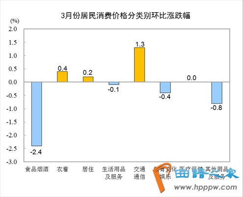 3月份,全国居民消费价格环比下降0.5%。其中,城市下降0.5%,农村下降0.6%;食品价格下降3.6%,非食品价格上涨0.2%;消费品价格下降0.8%,服务价格下降0.1%。