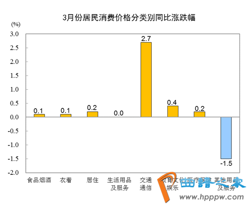 3月份,食品烟酒类价格同比上涨0.1%,影响CPI(居民消费价格指数)上涨约0.03个百分点。食品中,水产品价格上涨8.1%,影响CPI上涨约0.14个百分点;鲜果价格上涨4.0%,影响CPI上涨约0.08个百分点;蛋类价格上涨3.4%,影响CPI上涨约0.02个百分点;粮食价格上涨1.4%,影响CPI上涨约0.02个百分点;畜肉类价格下降9.1%,影响CPI下降约0.40个百分点,其中猪肉价格下降18.4%,影响CPI下降约0.45个百分点。