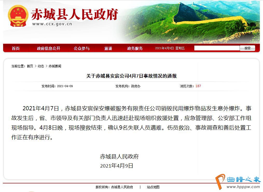 中新网4月9日电 河北省赤城县人民政府9日在官网发布通报称,4月7日,赤城县安宸保安爆破服务有限责任公司销毁民用爆炸物品发生意外爆炸。事故发生后,省、市领导及有关部门负责人迅速赶赴现场组织救援处置,应急管理部、公安部工作组现场指导。4月8日晚,现场搜救结束,确认9名失联人员遇难。伤员救治、事故调查和善后处置工作正在有序进行。