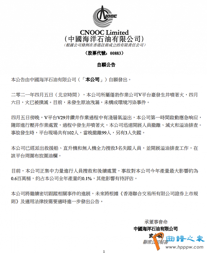 本公司已经派出救援船、直升机和无人机全力搜救3名失踪人员,并开展溢油排查工作,在该平台周围布放围油栏。目前,本公司正集中力量进行人员搜救和后续处置,事故对本公司今年产量最大影响约为0.6百万桶,约占本公司全年产量的0.1%,其他影响有待评估。
