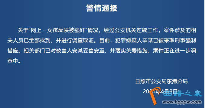 日照市公安局东港分局刚刚发布警情通报:关于“网上一女孩反映被强奸”情况,经过公安机关连续工作,案件涉及的相关人员已全部找到,并进行调查取证。目前,犯罪嫌疑人辛某已被采取刑事强制措施。相关部门已对被害人安某妥善安置,并落实关爱措施。案件正在进一步调查中。