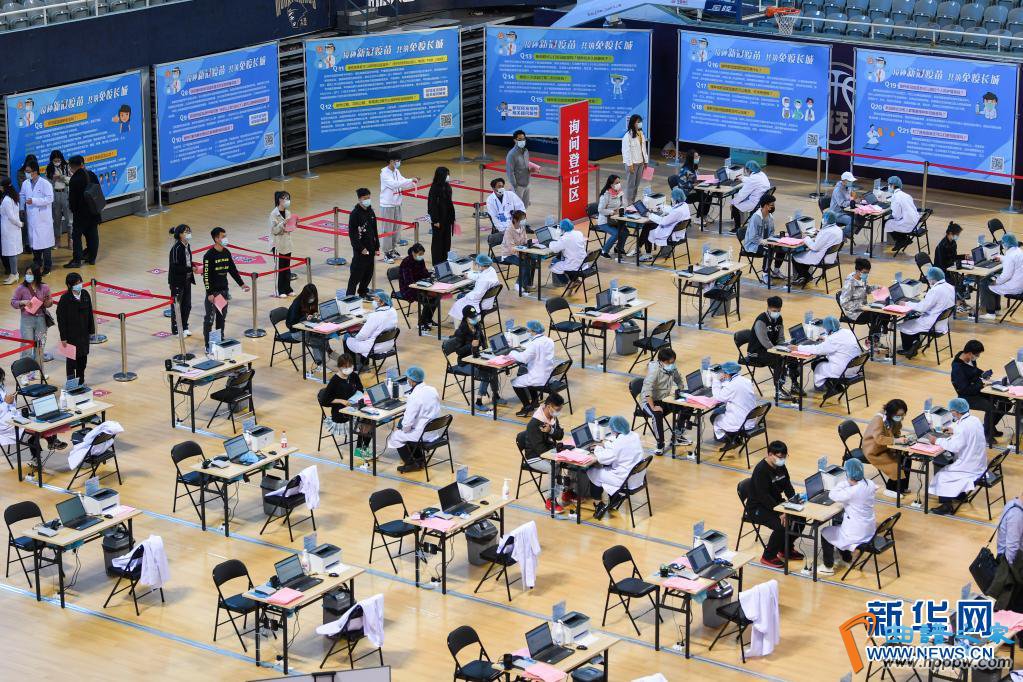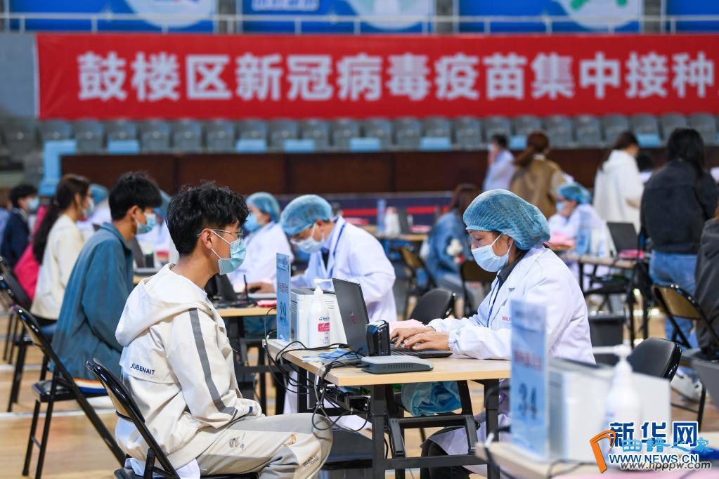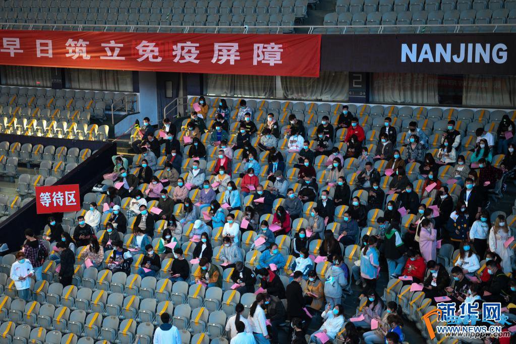 4月9日拍摄的设置在南京市鼓楼区五台山体育中心的新冠病毒疫苗集中接种点。近日,江苏省南京市在鼓楼区五台山体育中心设置新冠病毒疫苗集中接种点。这是目前南京市最大规模的集中接种点,单日接种量可达10000剂次。新华社记者 李博 摄