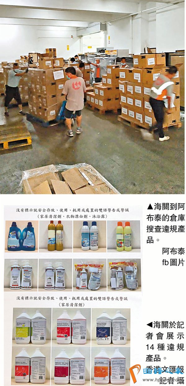 星岛环球网消息:文汇网讯 国安案重犯林景楠创办的"黄店"阿布泰国生活百货,因所售卖14款沐浴露、家居清洁剂、衣物漂白剂,未有标示中文及英文双语警告或警诫字句,涉嫌违反《消费品安全条例》的附属法例《消费品安全规例》。海关前日搜查"阿布泰"25间分店及荃湾仓库,共检获8,805件违例货品,总值约40万港元,并拘捕负责营运的33岁男董事,海关表示不排除更多人被捕。事发后,阿布泰"认错唔认衰",一方面自称"疏忽"向消费者道歉,另一方面就抹黑海关是次行动,以受到"打压"为名再次"抽水",更怂恿"黄丝"笃灰投诉其他商户的产品。