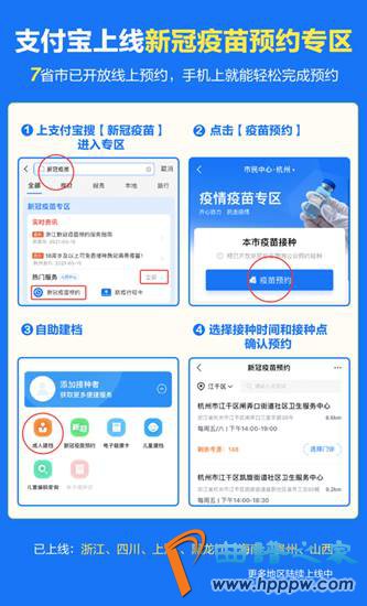 4月9日,支付宝上线新冠疫苗预约专区,全国7省市包括浙江、四川、上海、黑龙江、海南、贵州、山西等均已将面向公众的预约接种服务搬上了支付宝。