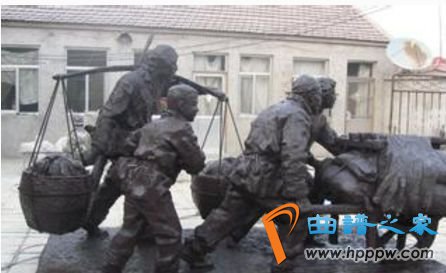 在1948年的那个寒冬里,千千万万的支前民工就是这样推着独轮车,以“最后一把米,用来做军粮,最后一尺布,用来做军装,最后的老棉被,盖在担架上,最后的亲骨肉,含泪送战场”的胸怀,迎着危险、冒着大雪,舍生忘死、冲向前线。